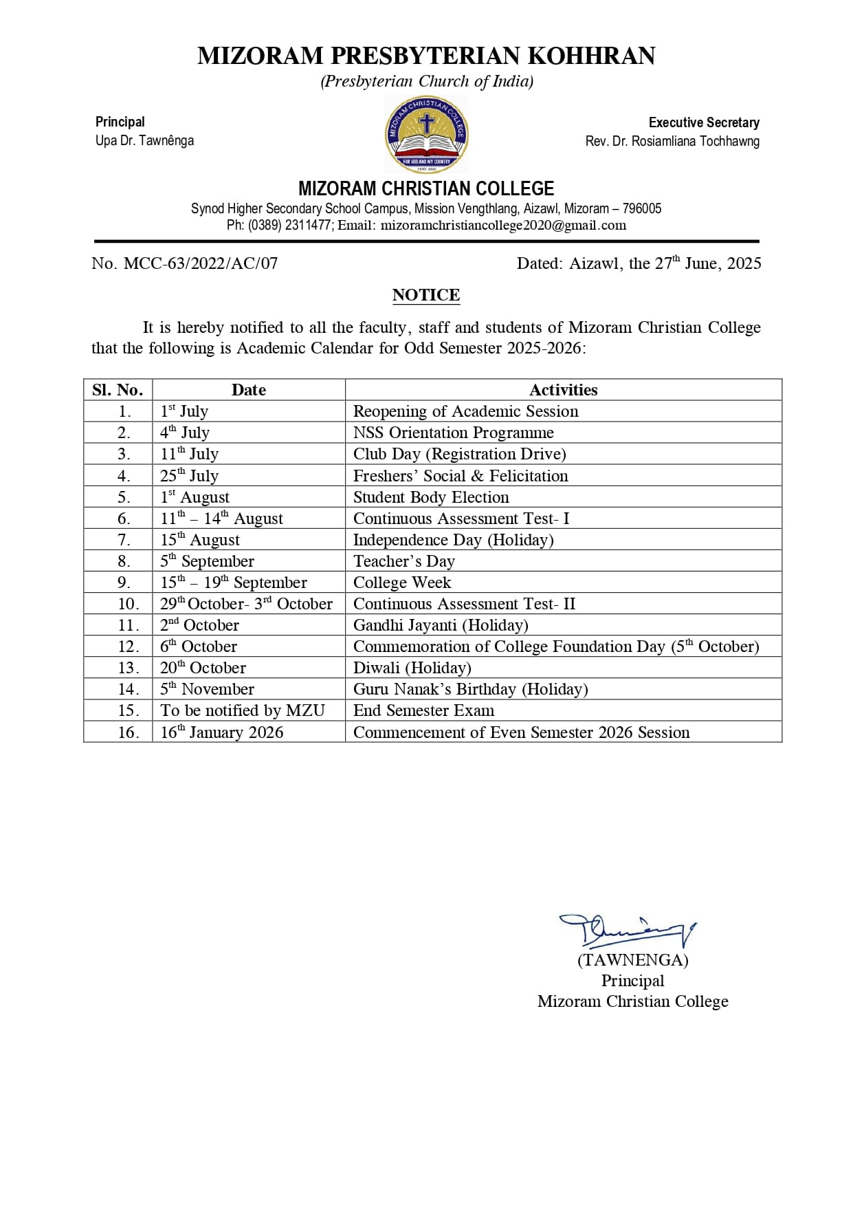 MCC is a minority institution under constitutional provisions, upholding its Christian identity while being inclusive to all, regardless of gender, status, or faith. It adheres to academic standards set by the UGC, Mizoram University, and the Government of Mizoram. Open to collaborations at local, national, and international levels, MCC remains firmly rooted in its mission as a Synod-managed institution.