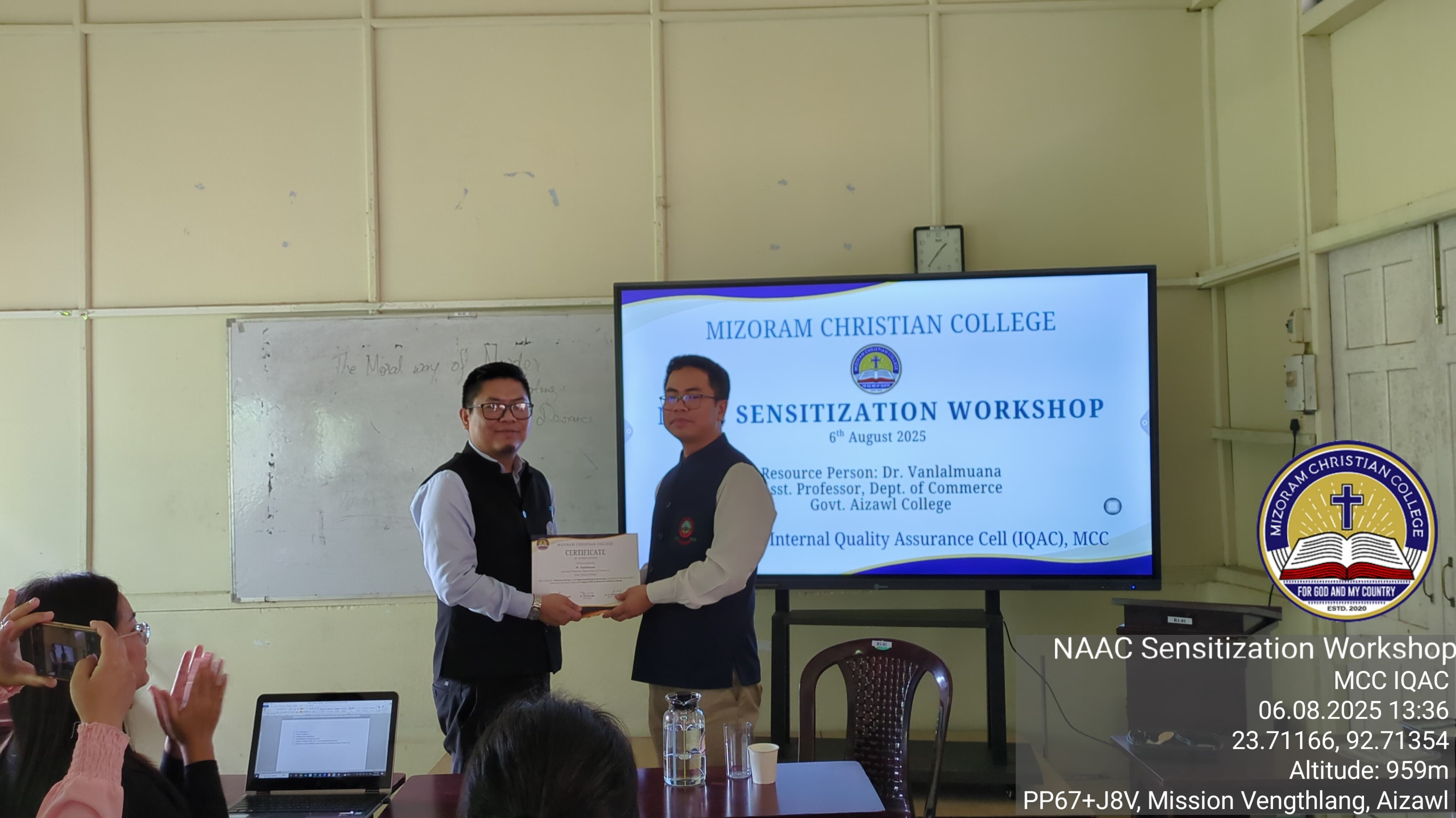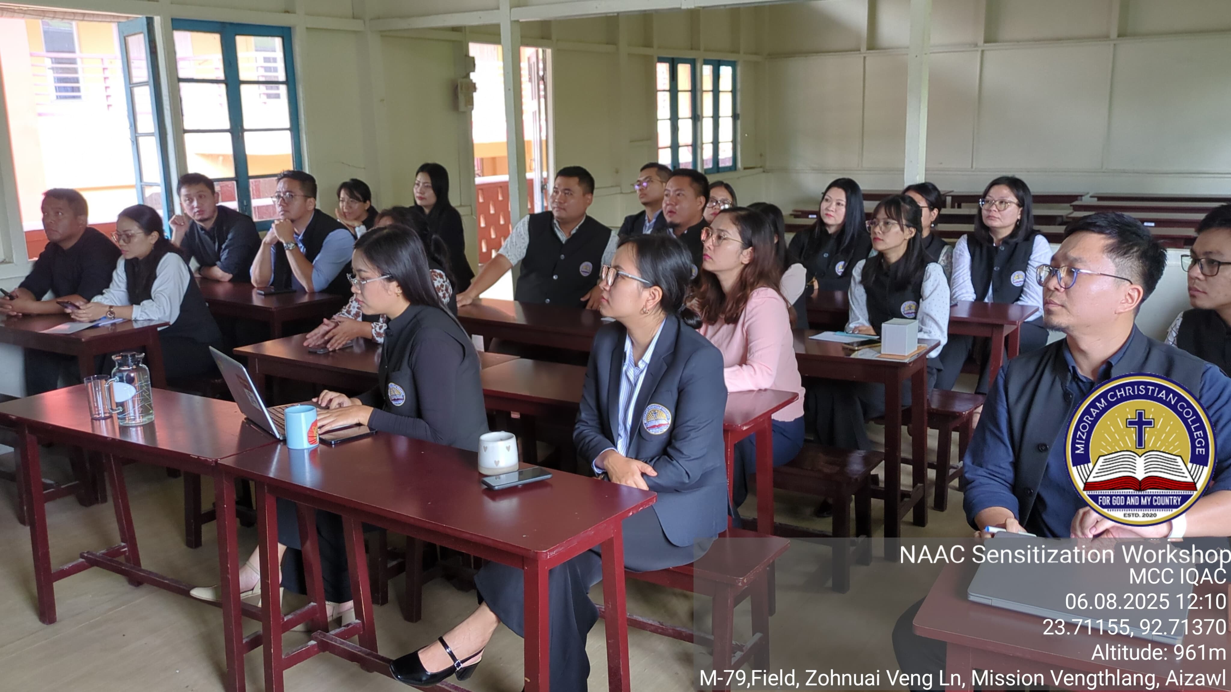 The Internal Quality Assurance Cell (IQAC) of Mizoram Christian College successfully organized a NAAC Sensitization Workshop on 6th August 2025. The primary objective of the workshop was to enhance awareness and understanding of the National Assessment and Accreditation Council (NAAC) process among faculty members and stakeholders.